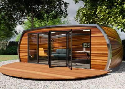The Cabin represents the pinnacle in luxury outdoor space. A stunning polished red cedar exterior provides a versatile living or work area, where you can enjoy time wrapped in the cocoon of wood, complete with picture-frame views through the huge opening widows. Enjoy the panorama from a bed/sofa or window seat, giving you a blended indoor & outdoor experience; with handmade awning over the decking sheltering you from the elements.